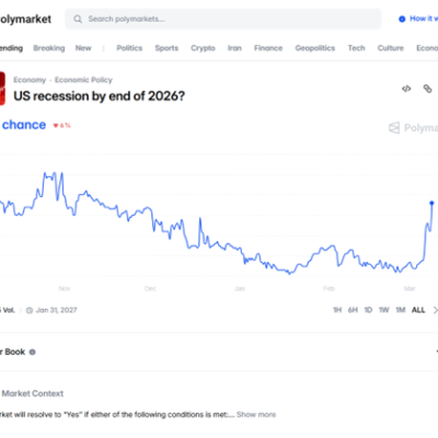 Polymarket, using definition of 2 quarters of consecutive negative GDP growth OR NBER declaration. It was only 23% on February